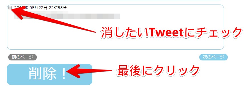 チェックを付け間違えて重要なTweetが削除されるということがないように、削除を実行する前にはしっかりチェックしましょう。