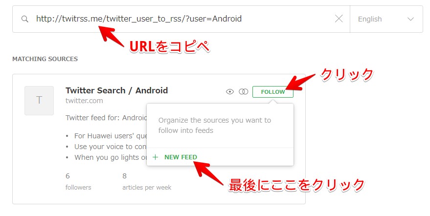 ログインしたら検索ウィンドウに先程取得したURLをコピペして検索しましょう。検索するとアカウントがヒットするので「FOLLOW」をクリックして表示される「NEW FEED」をクリックしてください。