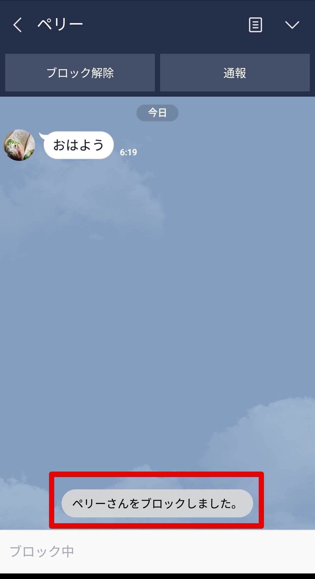 作業が完了するとトーク画面のテキスト入力欄に「ブロック中」と表示されます。これ以降やり取りができなくなります。