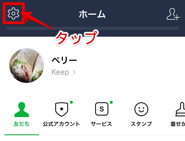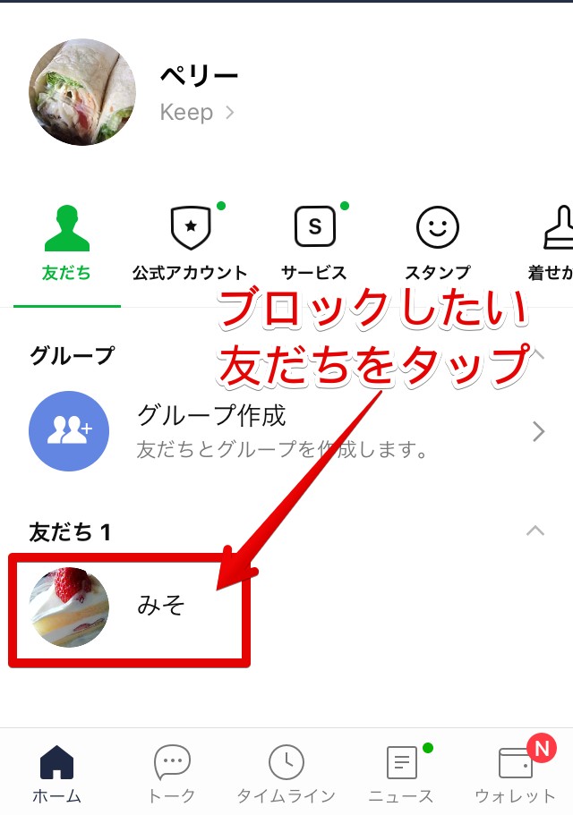 「LINE」公式アプリを開いてホーム画面を表示し、友だち一覧からブロックしたいアカウントをタップで選びます。