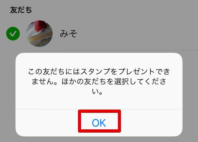 友だちがLINEスタンプを持っているか、もしくはブロックされている場合は、次の画面で「この友だちにはスタンプをプレゼントできません」と表示されます。
