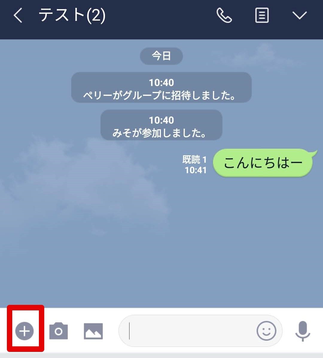 まずはグループのトーク画面下にある「+」アイコンをタップし、メニューを表示してください。