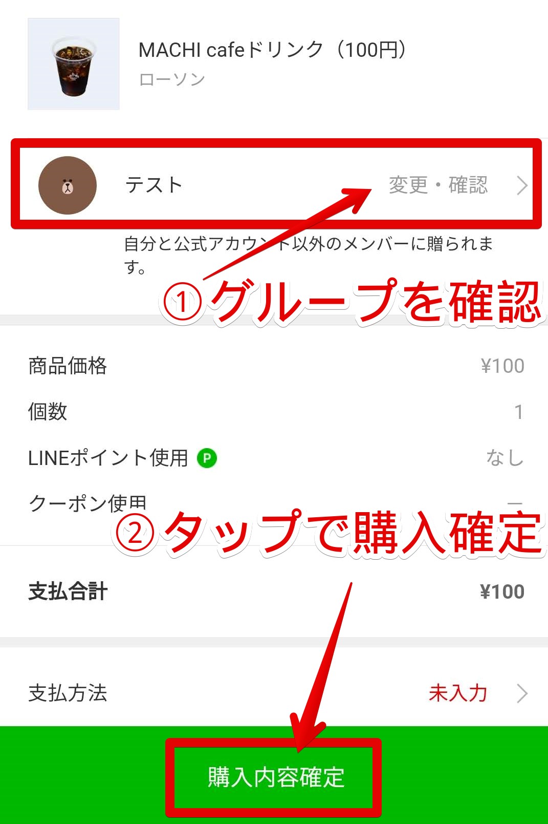 送るグループや価格を確認し、「購入内容確定」をタップします。