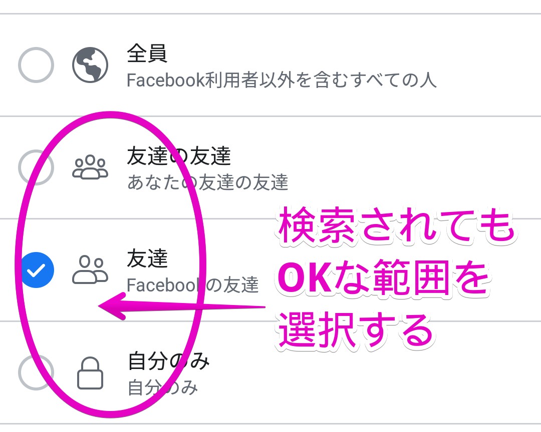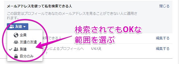 自分を検索できる人の範囲を、「友達の友達」「友達」「自分のみ」から選択します。