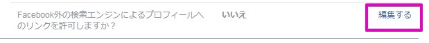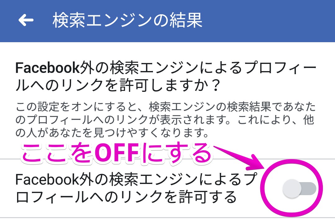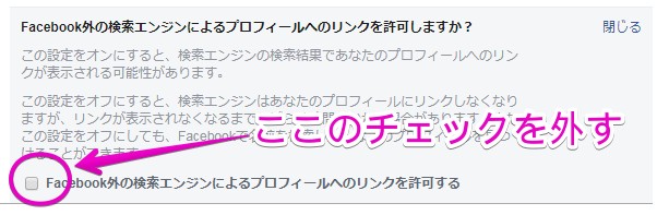 「Facebook外の検索エンジンによるプロフィールへのリンクを許可する」をオフにします。