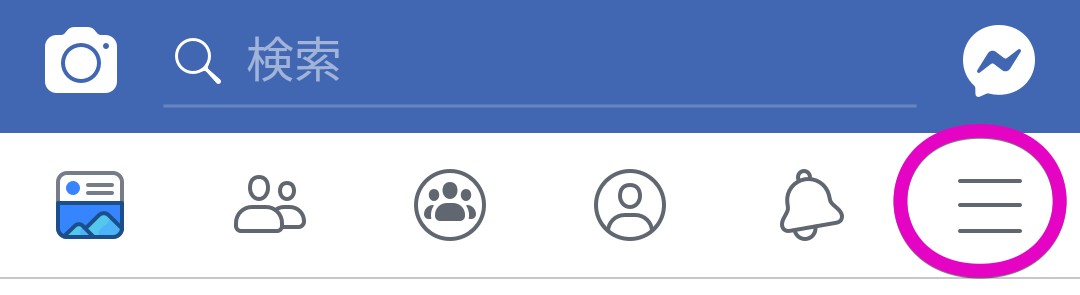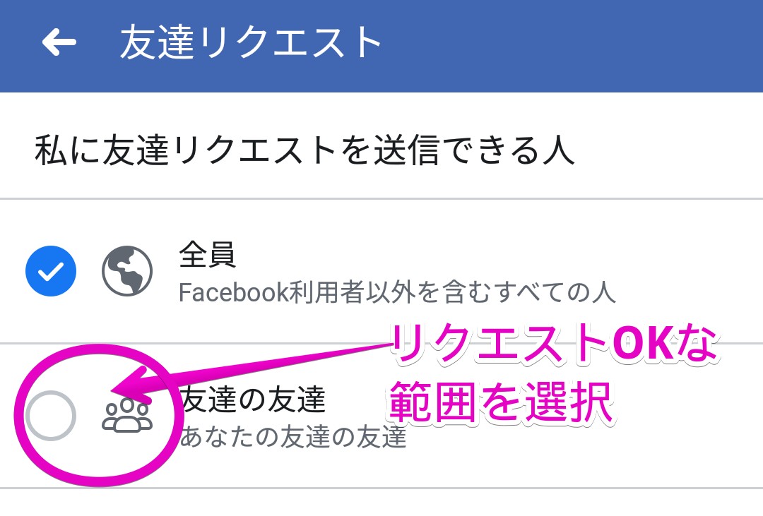 友達リクエストを受け付ける範囲を「全員」「友達の友達」の2つから選びます。ここではより範囲の狭い「友達の友達」に設定しておきましょう。スマホの場合もさきほどと同様に、まずは右上のメニューアイコンをタップします。