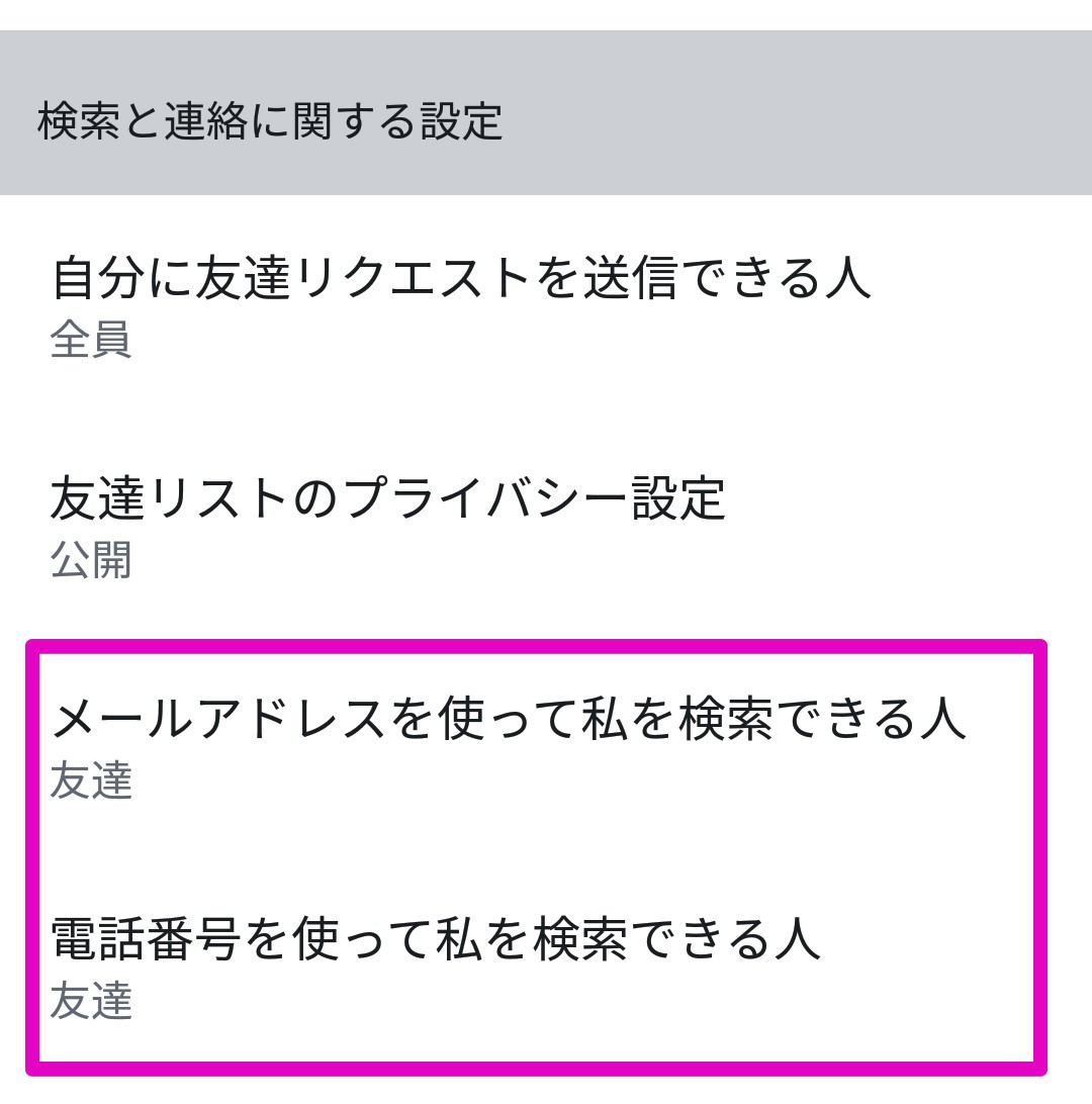 「プライバシー設定」の画面に変わったら、「検索と連絡に関する設定」の項目のなかの「メールアドレスを使って私を検索できる人」「電話番号を使って私を検索できる人」をそれぞれタップしましょう。