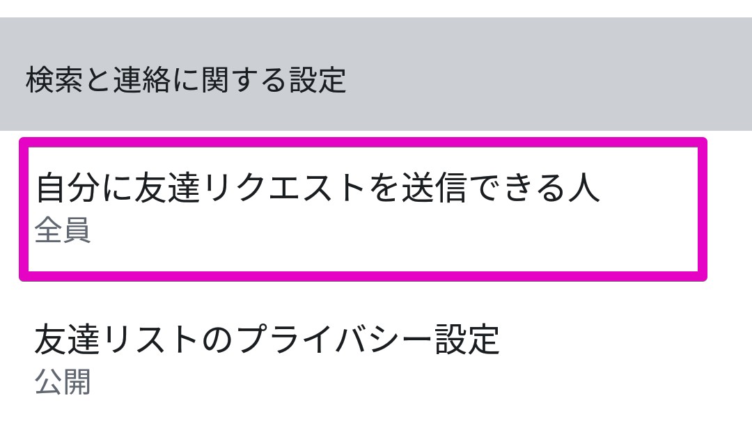 「プライバシー設定」の画面に変わったら、「検索と連絡に関する設定」の項目のなかの「自分に友達リクエストを送信できる人」をタップしましょう。
