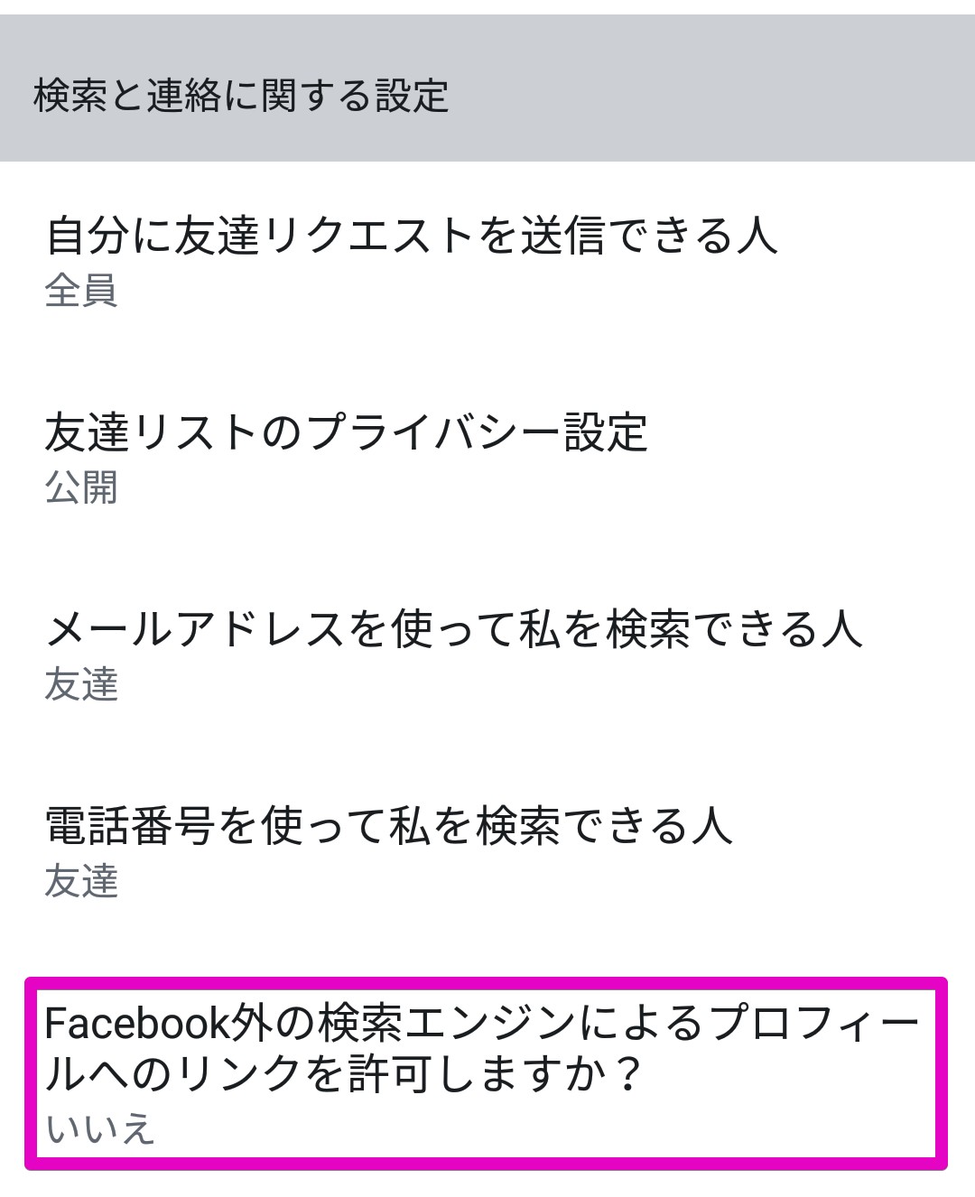 「プライバシー設定」の画面に変わったら、「検索と連絡に関する設定」の項目のなかの「Facebook外の検索エンジンによるプロフィールへのリンクを許可しますか?」をタップしましょう。