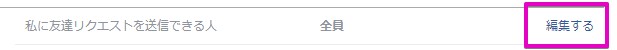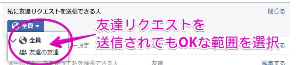 現在の検索可能範囲が「全員」になっている場合は、「友達の友達」「友達」「自分のみ」のどれかに変更します。