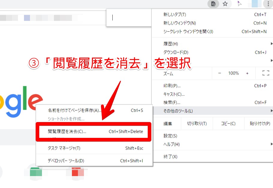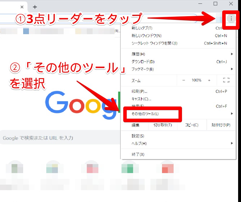 今回は「Google Chrome」でのキャッシュクリアを紹介します。まずは「Google Chrome」のブラウザを起動します。右上にある3点リーダーをクリックし、メニューから「その他のツール」を選びましょう。