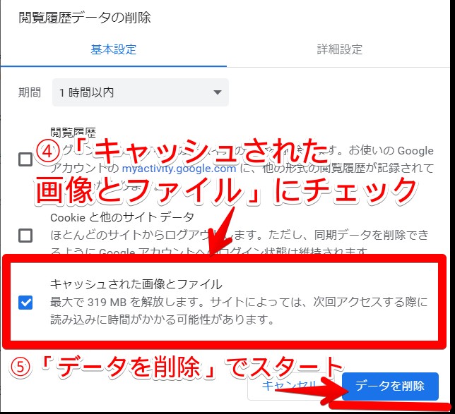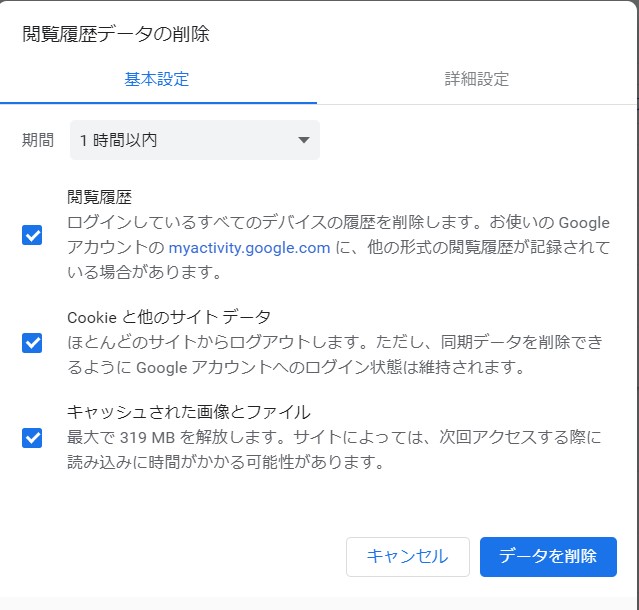 全てのチェックボックスにチェックを入れたままデータを削除すると、ほかのサイトの閲覧履歴やデータが全て削除されてしまうため、あくまで画像とファイルのみ整理したいのであれば、外すようにしておきましょう。