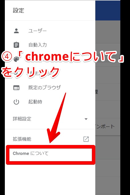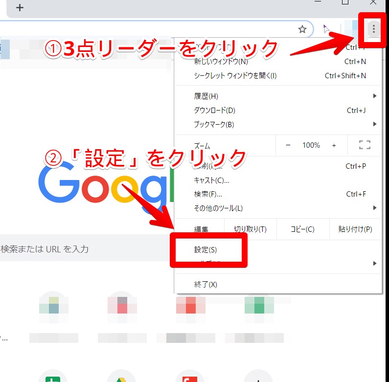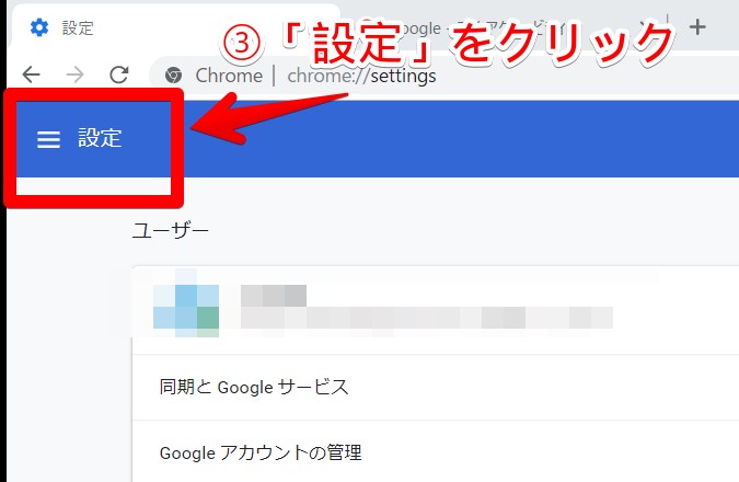 先ほどと同じように「Google Chrome」の右上にある3点リーダーをクリックし、メニューから「設定」をクリックします。