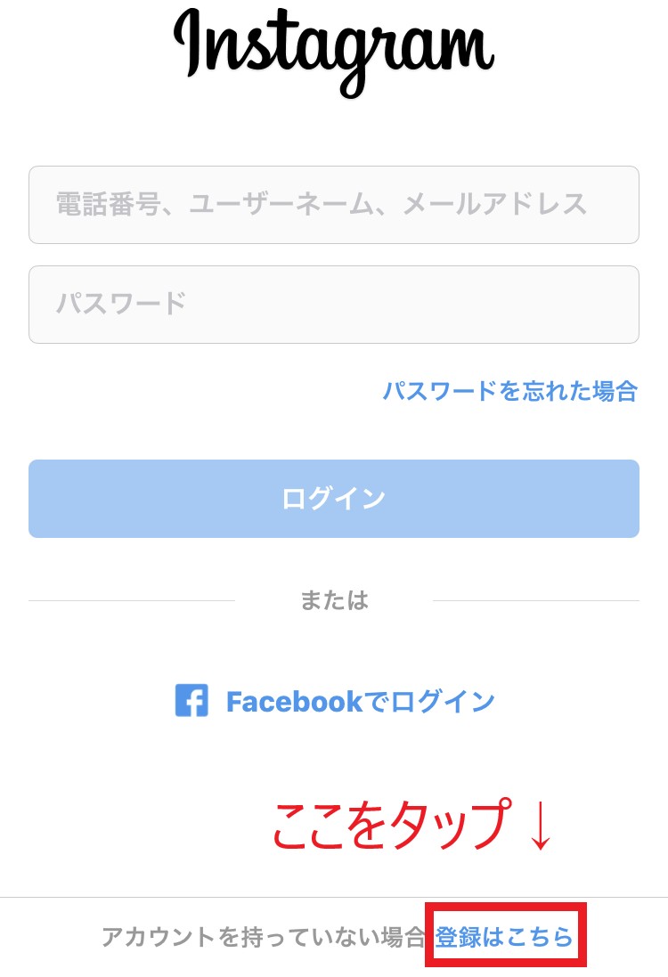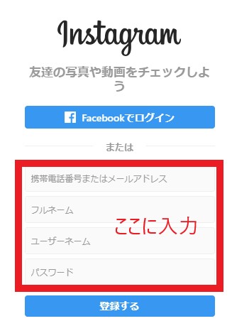 Instagramへのログイン画面が表示されるため、携帯番号またはメールアドレス、フルネーム、ユーザーネーム、パスワードを入力→「登録」をタップすれば完了です。