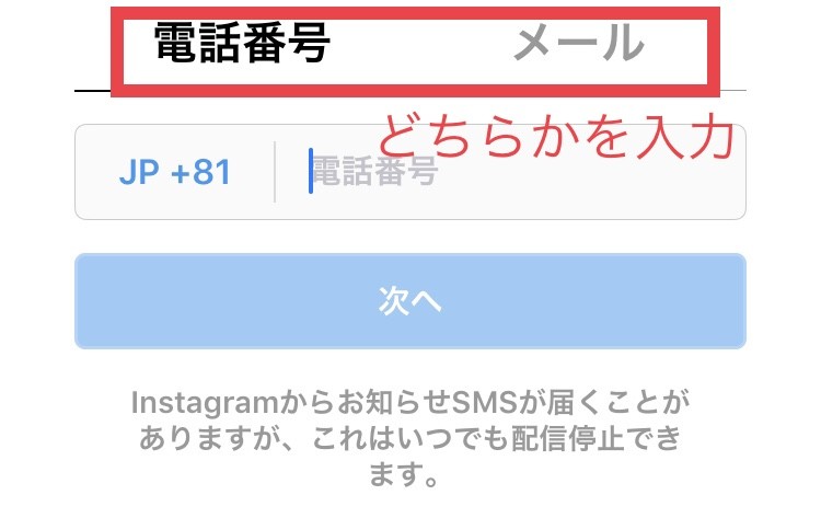 まず、電話番号かメールアドレスのどちらかを入力します。
