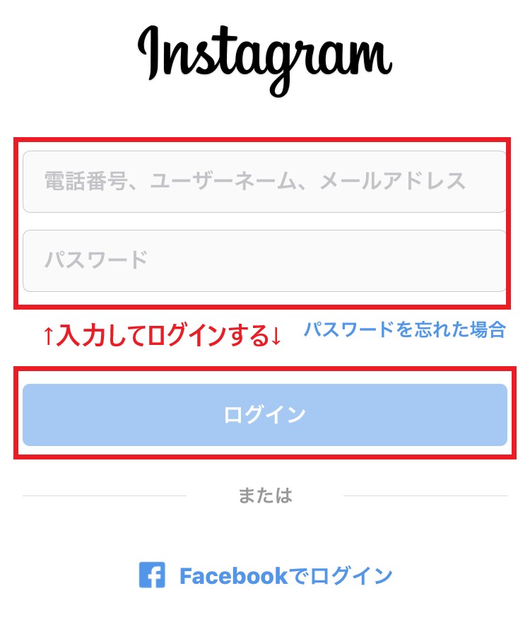 ログイン画面が表示されるため、電話番号・ユーザーネーム・メールアドレスのいずれかと、パスワードを入力してログインしましょう。