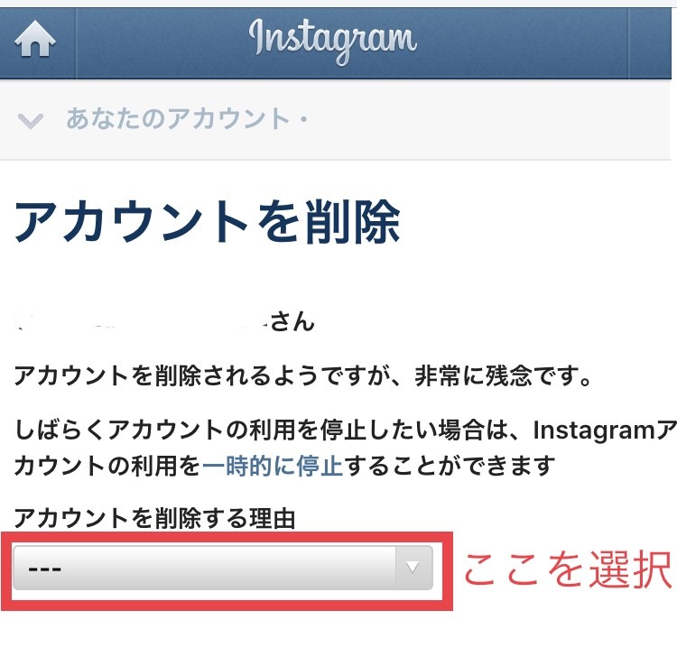 アカウント削除専用ページを開くと「アカウントを削除する理由」が表示されるため、当てはまるものを選択します。