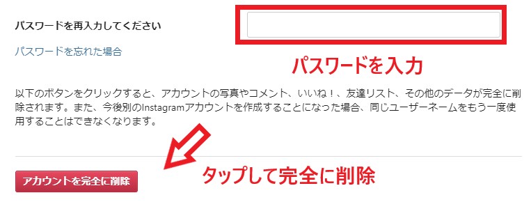 パスワードを再入力し、「アカウントを完全に削除」をタップします。最後に「アカウントを削除しますか?」と表示されるため「OK」をタップすれば完了です。