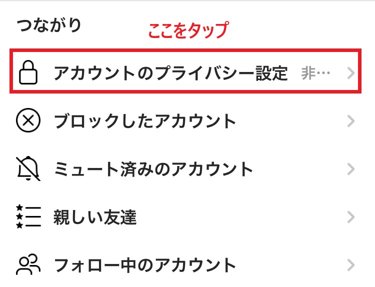 アプリ画面右下の自分のプロフィール→画面右上の「設定」のメニュー→「プライバシー設定」→「つながり」の「アカウントのプライバシー設定」をタップする。