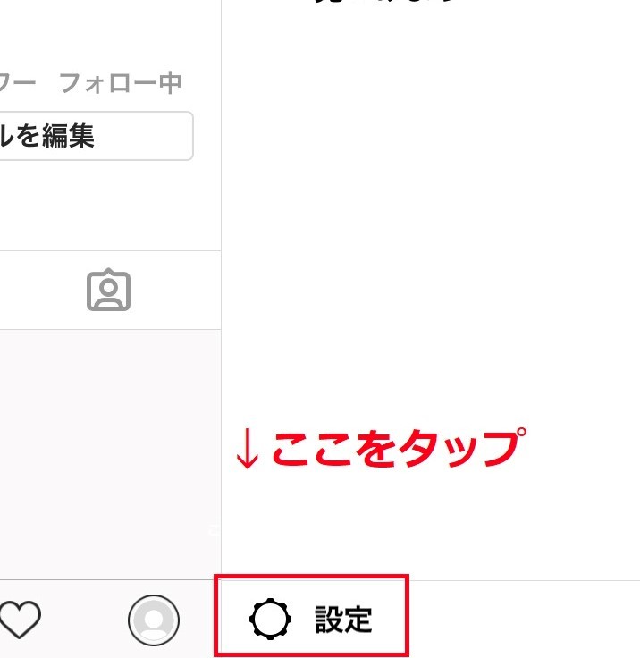 アプリ画面右下の自分のプロフィールタブ→画面右上の「設定」のメニューアイコン→画面最下部の「設定」とタップします。