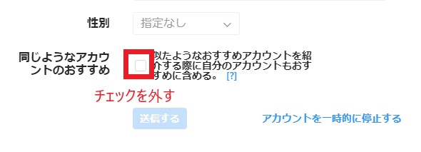 「同じようなアカウントのおすすめ・似たようなおすすめアカウントを紹介する際に自分のアカウントもおすすめに含める。」のチェックを外せば完了です。