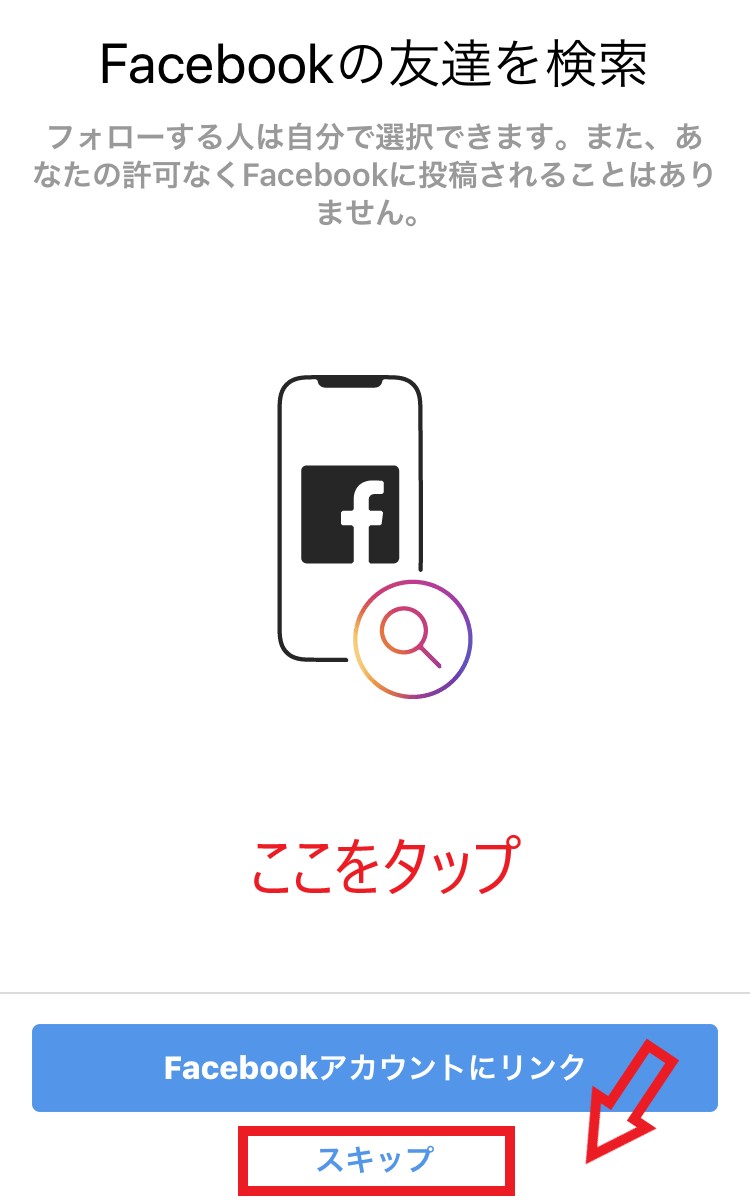 「Facebookアカウントにリンク」を選択してしまうと、Facebookの友達がInstagramにも同期されてしまい、アカウントがバレてしまいます。メッセージが表示されたら「スキップ」を選びましょう。