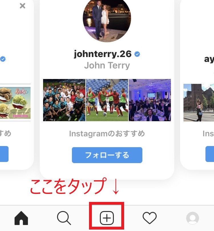 アプリ画面下部分中央の「投稿」のアイコンをタップし、投稿したい写真や動画を選択します。