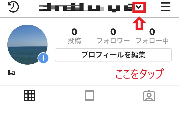 アプリ画面右下の「マイページ」のアイコンをタップし、画面上部の「(アカウント名)v」の文字をタップします。