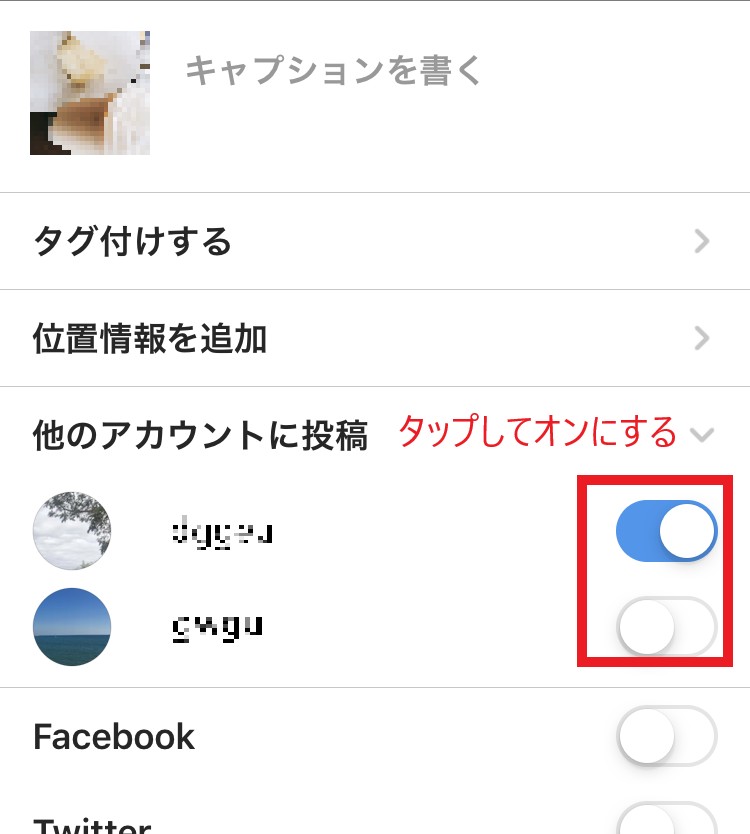 「新規投稿」と表示されている画面の「他のアカウントに追加」の項目で、投稿したいアカウントのボタンをオンにすれば完了です。青く表示されていればオンになっています。
