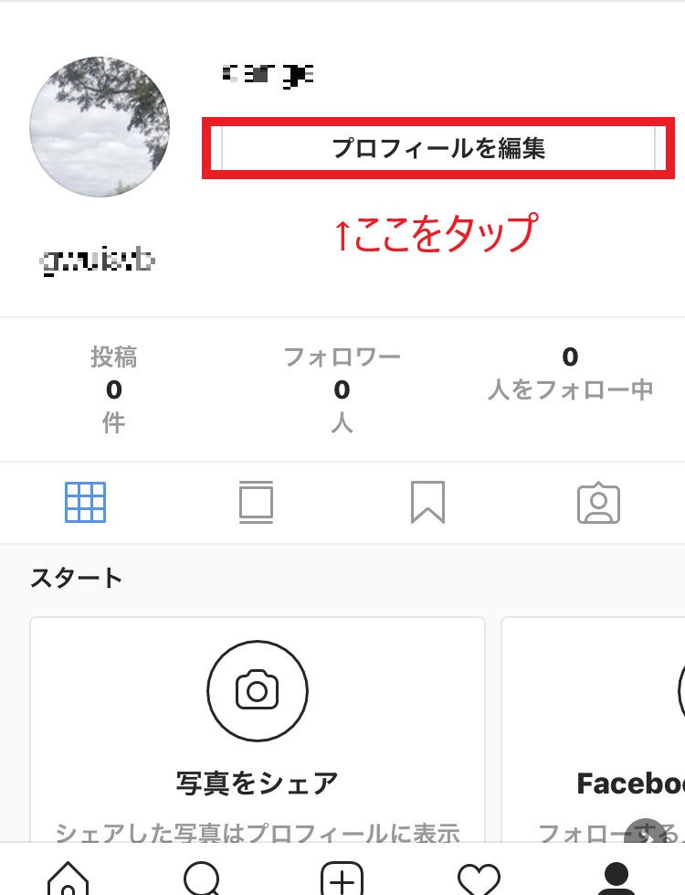 PC版のInstagramにログインし、(スマホからの場合はブラウザでInstagramページを開く)アプリ画面右下の自分のプロフィール→画面上部の「プロフィールを編集」をタップします。