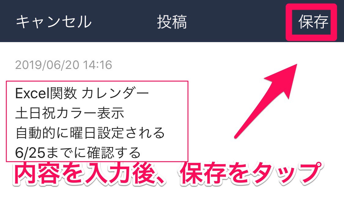 テキストを開くと投稿ページが表示されるので、空欄に投稿する内容を入力し、右上の「保存」をタップしましょう。