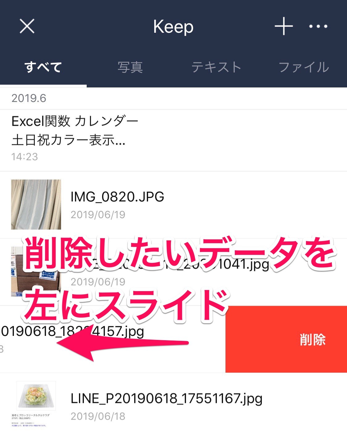 1つめの方法は、Keep画面の「すべて」のタブを開き、削除したいデータを左にスライドします。「削除」の表示が徐々に大きくなり、左までスライドするとデータが削除されます。