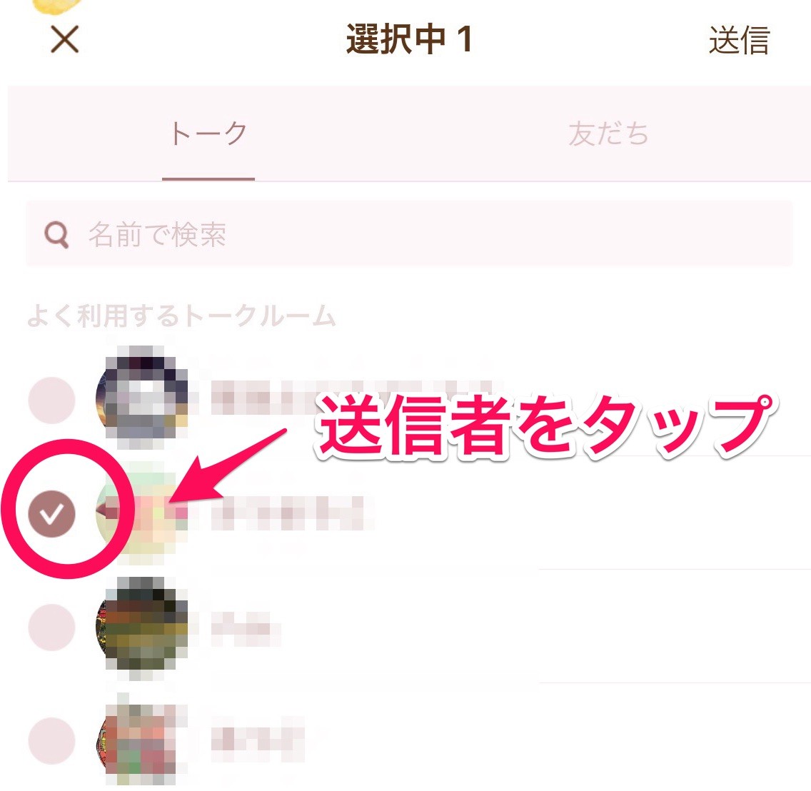 トーク一覧が開くので、送信したい人をタップします。送信できる人はトークルームごとに選択できるので、個人でもグループでも可能です。このとき、どちらの一覧(トーク・友だち)からでも送信できるので、探しやすい方を選ぶとよいでしょう。