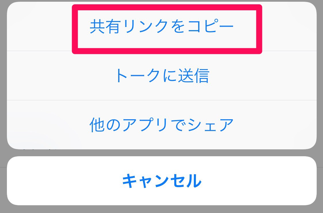 選択したデータに「共有マーク」が追加されます。LINEのトーク画面に「共有リンクをコピー」を貼り付けると、選択した人(トークルーム)と自分だけがデータを共有できます。
