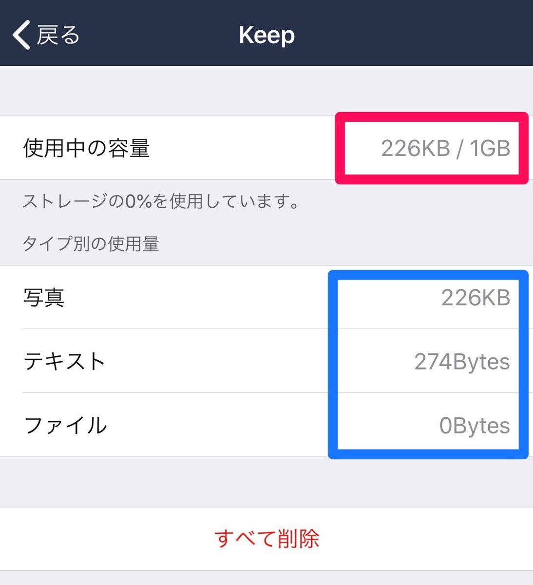LINE Keepで使用している全体の容量が赤枠内に表示され、タイプ別の使用量は青枠内に表示されます。容量が多くなりすぎた場合は、使用量を確認しつつ削除することも視野に入れるとよいでしょう。
