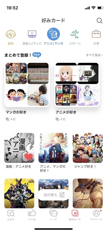 例えば、アニメ・漫画のジャンルを見ると、「少女漫画が好き」「週刊少年ジャンプ」という好みをアピールするものから、「〇〇というアニメが好き」など作品ごとのカードも多数あります。登録できるカードが豊富にあるので、あまりメジャーではないジャンルのオタクでも出会いを探しやすいでしょう。