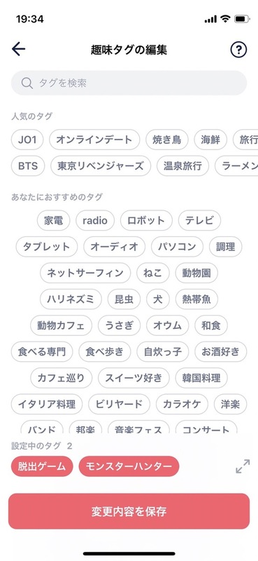 例えば「脱出ゲーム」の趣味タグを登録すると、自分のプロフィールカードに「脱出ゲーム」という情報が設定されます。タグを設定すれば相手からの検索に引っかかりやすくなるので、なるべく多くのタグを登録してみてください。