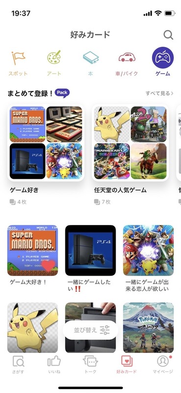 「一緒にゲームしたい」「音楽ゲーム大好き」というカードはもちろん、人気作品ごとの好みカードも多数あります。ゲームに関する好みカードの種類が非常に多いので、趣味が合う異性とマッチングする可能性も高いです。