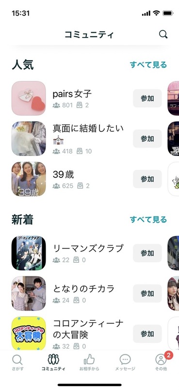 | ペアーズ | ・利用者数がトップクラスに多い ・コミュニティ機能を使えば出会える確率が高まる |