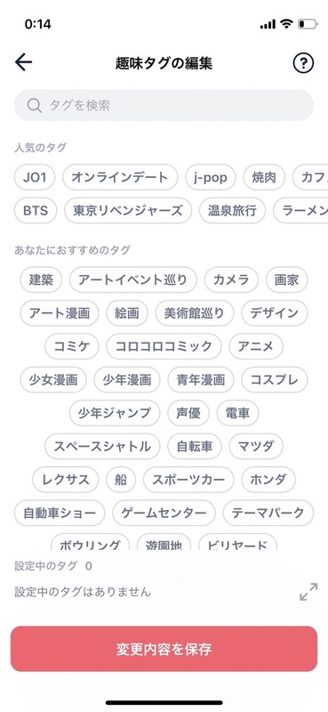 検索画面から趣味タグを検索すれば、同じタグを登録している異性を探すことも可能です。趣味タグは簡単に登録できて設定上限もないので、少しでも興味があるものは積極的に登録しておくと良いでしょう。