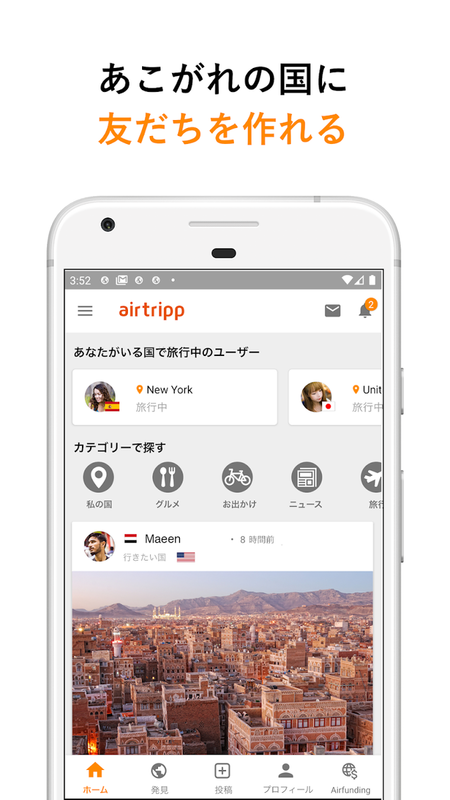 | エアトリップ | 興味がある国のユーザーと出会える |