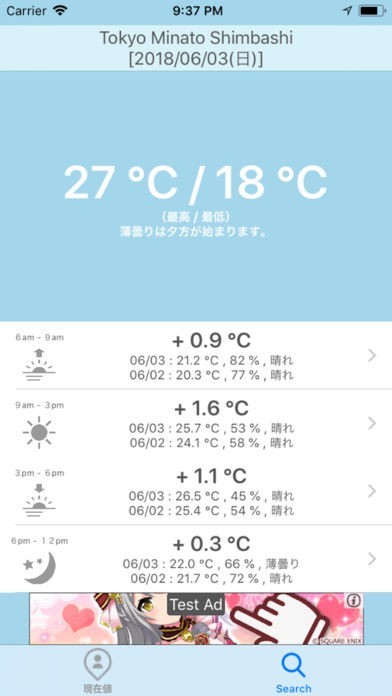 1日4回、朝/昼/夕/夜それぞれの体感温度と天気情報を知ることができます。最高体感温度と最低体感温度も分かるので、時間毎の服装調節情報を知りたい方にもピッタリです。