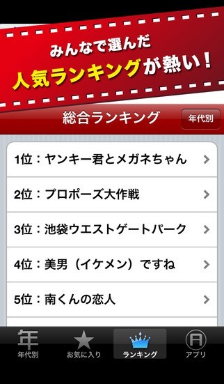 このアプリを使えば、1300以上あるドラマを無料で見ることが出来るので、テレビの代わりとして楽しむことが出来ます。 特に90年代からのものを見ることが出来るので、昔のものをもう一度見たいというような方を満足させてくれることでしょう。 アプリ左下にある、「年代別」をタップすることによって、各年代のものを見れるので、自分が好みのものを選び出すことが出来ます。 そして、星マークをタップすれば、「お気に入り登録」することが出来、まとめてチェックすることが出来ます。 他にも、「総合ランキング」では、「池袋ウエストゲートパーク」や「ヤンキー君とメガネちゃん」などというような人気作品を確認することが 出来ます。