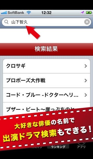 扱っているジャンルはドラマであり、1300以上あるものを無料で見ることが出来るので、テレビの代わりとして楽しむことが出来ます。 特に90年代からのものを取り扱っていて見ることが出来るので、昔のものをもう一度見たいというような方を満足させてくれることでしょう。 アプリ左下にある、「年代別」をタップすることによって、各年代のものを見れるので、自分が好みのものを選び出すことが出来ます。 そして、星マークをタップすれば、「お気に入り登録」機能を使うことが出来、まとめてチェックすることが出来ます。 他にも、「総合ランキング」では、「ヤンキー君とメガネちゃん」や「池袋ウエストゲートパーク」などというような話題になっている作品を確認することが出来ます。