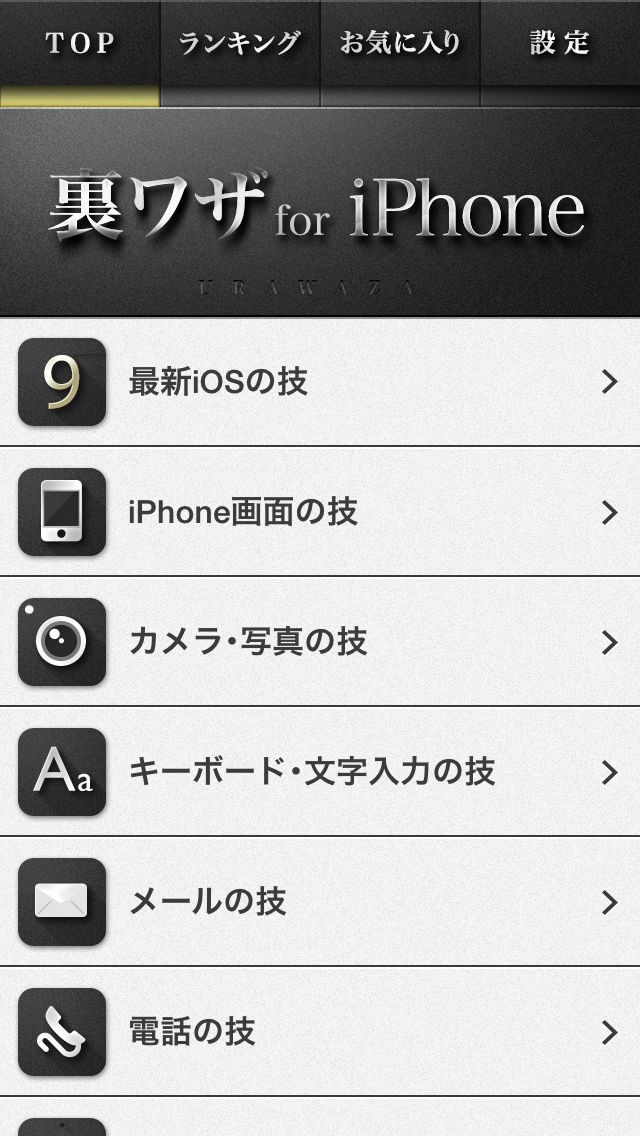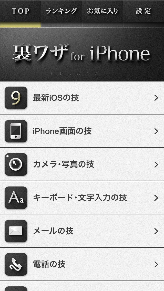 iPhoneをある程度使える状況になると、レアな技を覚えて使えるようになりたいと思う事があると思います。「[新]裏技for iPhone(使い方や説明書)」はそんな裏技を多数習得出来るアプリ。カテゴリ分けされた中から選択出来るので、目的の技の記述部分へすぐに飛ぶ事が出来ます。画像と文字情報で技の内容を見られるので、覚えやすいです。又iPhone4等、過去のOS専用の裏技も収録。スマートフォンマニアにとっても面白くて、楽しいコンテンツが載っています。例えばこんな時に使える裏技はないだろうかとアプリで探し、技をどんどん覚えてスマートフォンオタクを目指すという道もアリです。