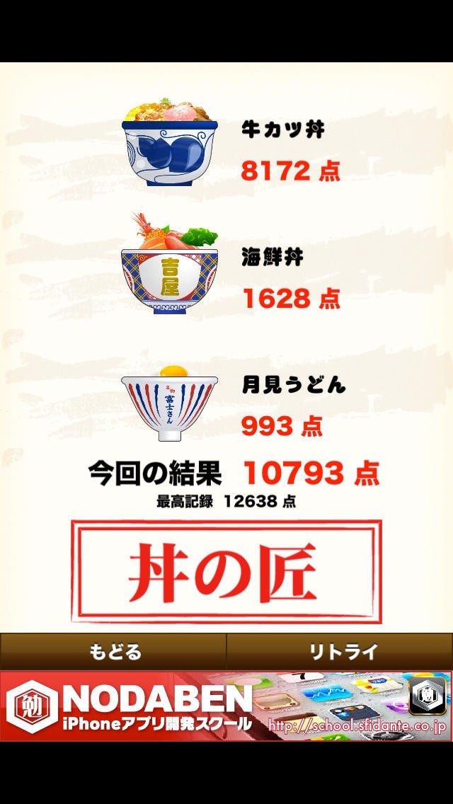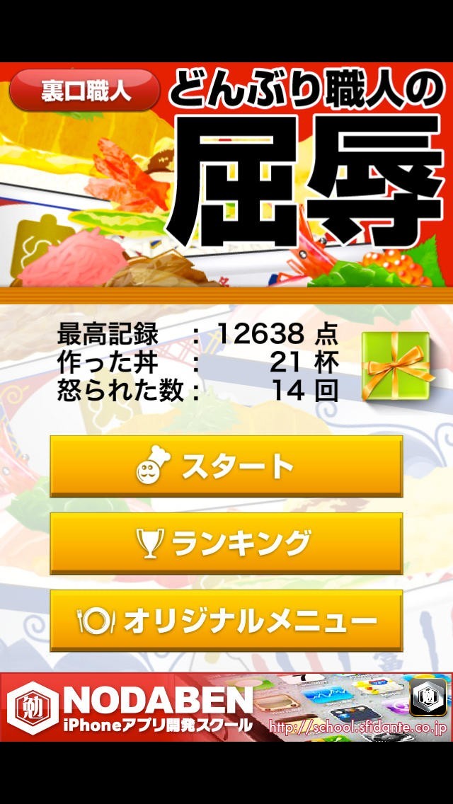 「どんぶり職人の屈辱」は、うどん・牛丼・かつ丼・天丼・海鮮丼を作っていくゲームアプリです。画面上部から次々に具が落ちてきますので、お客様の注文に合わせて正確にキャッチして丼にのせていくことが重要になってきます。かつ丼のどんぶりに海鮮を入れてしまうなど、ありえない組み合わせはしないように注意しなければなりません。アプリ内ではこぼさずに具を入れることが、高得点獲得のポイントになってきます。メニュー数は16種類あり、完成した丼はコレクションされていくのでどんどん作っていくことが大切です。休み時間などに友人らとスコアを競い合っても楽しいです。
