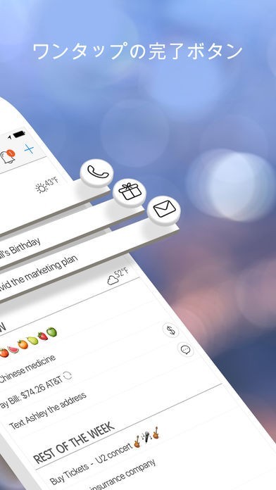 "Complete" を成し遂げるためにタップするだけで、タスクの自動補完を中心です: 電話、電子メール、テキスト メッセージを送信、購入ギフトおよび大いに多く - "Complete"使用と完了ボタン。