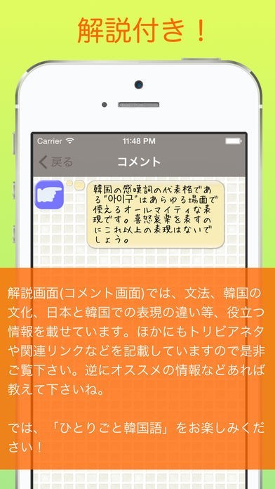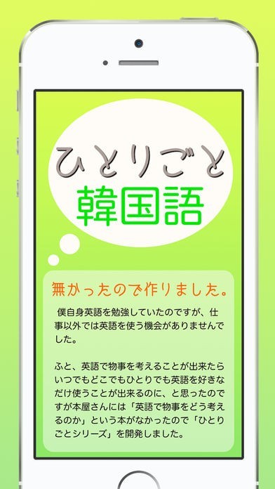 「ひとりごと韓国語」は独り言や頭の中で考えていることを韓国語に置き換えることで、会話力を高める学習アプリです。周りに韓国語を話せる相手がいない、という人にはおすすめのアプリです。