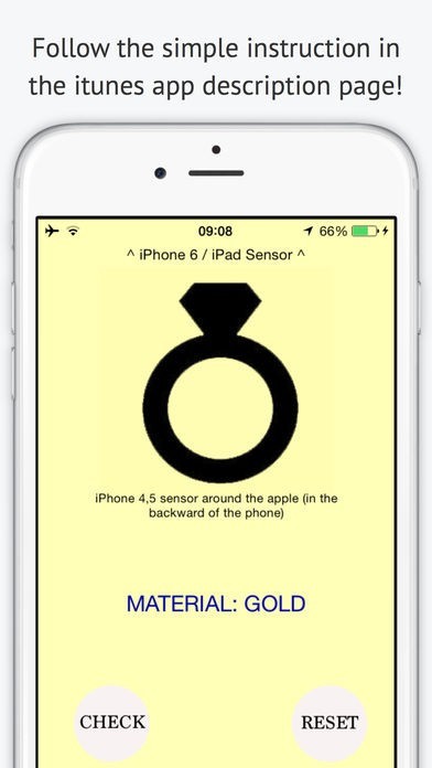 - Place the phone on top of the material to be analyzed (according to the appropriate location on the sensor, on iPad / iphone 6 in the upper end, on the other iPhone the sensor is AROUND THE APPLE, in the backward of the phone) and press "CHECK". You will see in the video composition of the object that you place in question!