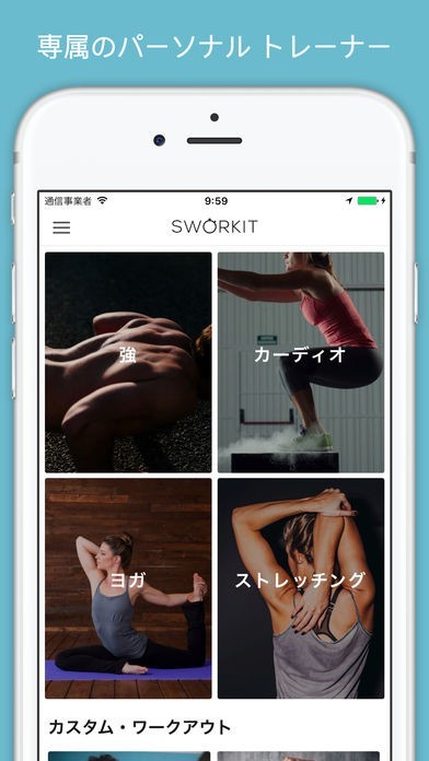 1400万ダウンロードを突破したパーソナルトレーナーアプリ「Sworkit」 ヨガや筋トレ、有酸素運動などを収録しており、アプリのガイドに従って運動を続けられるのが特徴です。 運動時間は5分から60分まで任意の時間で選択可能。 帰宅後のちょっとした空き時間には5分だけ、休日にはじっくり60分と、都合や目的に合わせてトレーニングを続けることができるでしょう。 自分だけのワークアウトを組み合わせてカスタマイズする機能なども用意されており、ダイエットにも活用できます。
